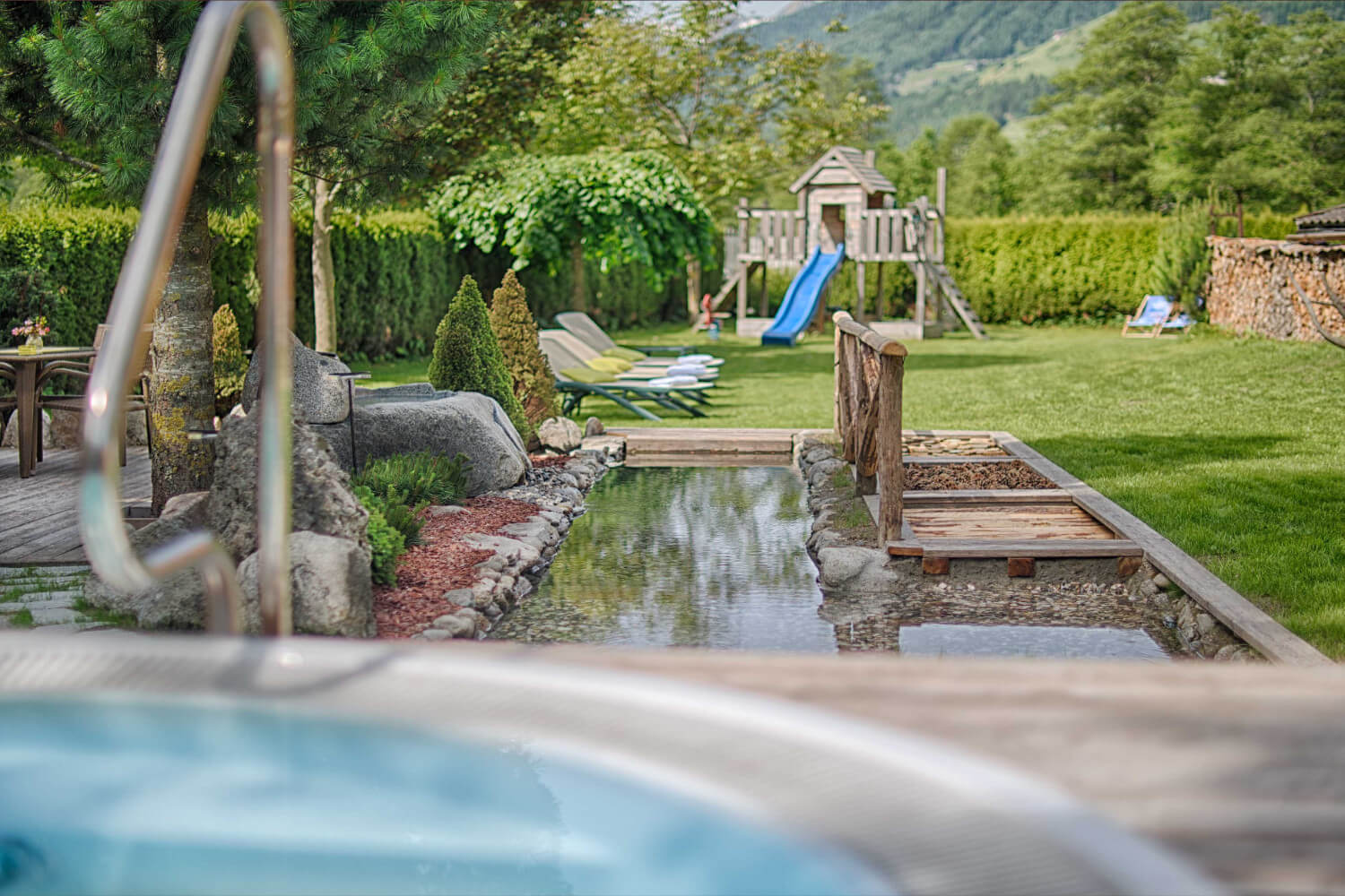 Großer Garten mit Whirlpool,  Kneipp-Bachlauf, Barfußpfad, Liegewiese und Kinderspielplatz